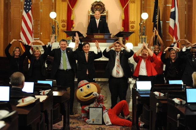 COLUMBUS—The Ohio House of Representatives today honored Brutus Buckeye during the Ohio House session in celebration of his 50th anniversary as mascot of The Ohio State University. Brutus was presented with a resolution that was sponsored by Representative Niraj Antani (R-Miami Township) and Representative Michael Stinziano (D-Columbus).